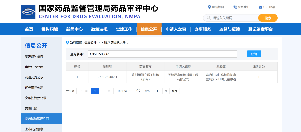 2025年11月3日, 天津昂赛细胞基因工程有限公司申报的注射用间充质干细胞(脐带)治疗难治性急性移植物抗宿主病(aGvHD)儿童患者的适应症获得国家药品监督管理局临床试验默示许可